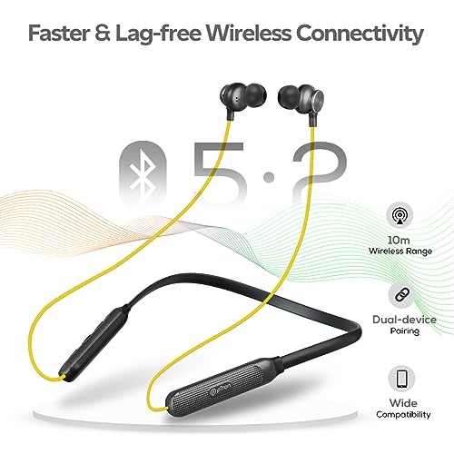 Attractive ergonomics with a lightweight sturdy built (just 26gms); Bluetooth headphone with mic comes with Bluetooth 5.2 for seamless 10mtrs connectivity, quick pairing, and broad compatibility.
