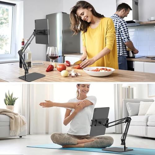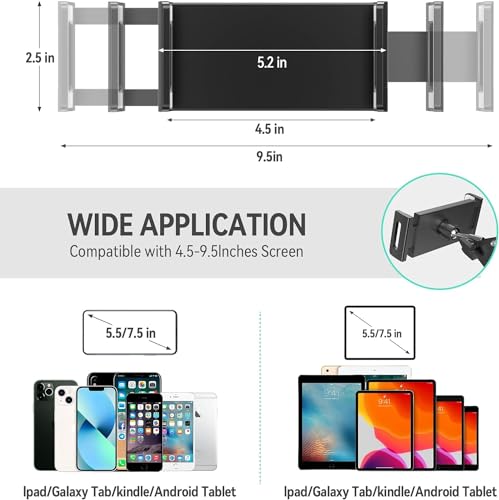 Made of the 360-degree rotation joint, 2 paragraphs, and 180° & 135° adjustable sturdy steel arms, this flexible tablet phone mount is easy to grab your device, twist it, raise it, turn it sideways, or in any direction you like. More Flexible Than Conventional Arm Design.2 paragraphs sturdy steel arms ensure durability and easy stability, multi-degree adjustable joint providing more precise and stable positioning than gooseneck bend design without any shaking.
