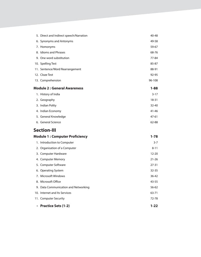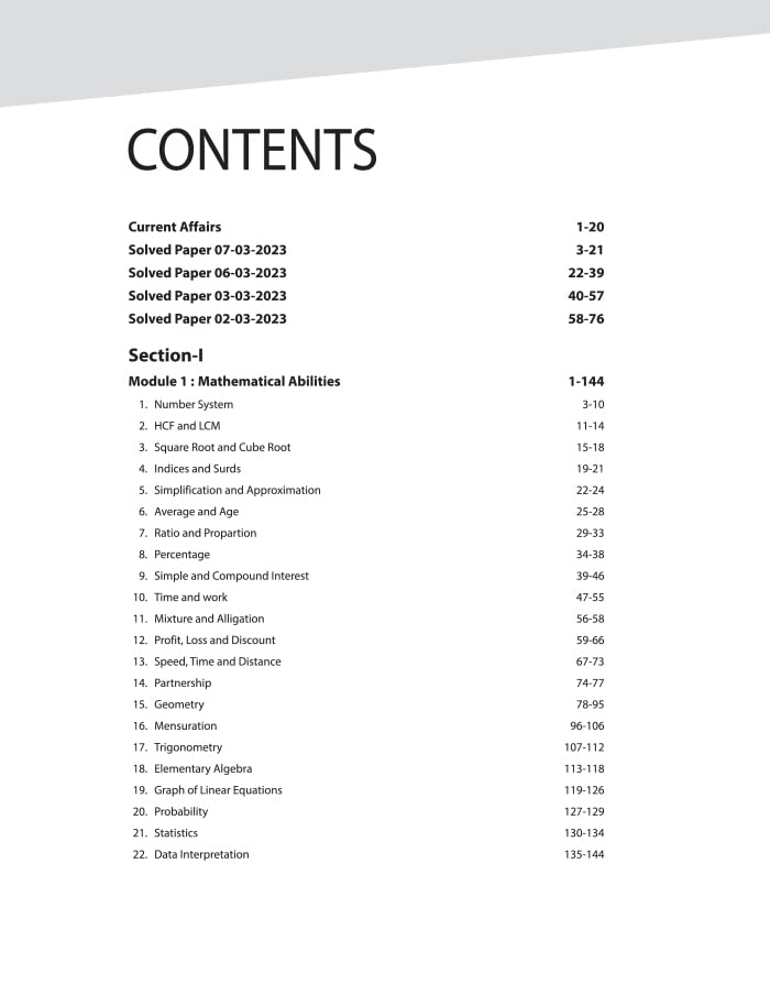 Current Affairs, Solved Paper (07-03-2023, 06-03-2023, 03-03-2023, 02-03-2023), Section I- Module 1: Mathematical Abilities, Module 2: Reasoning and General Intelligence, Section II- Module 1: English Language and Comprehension, Module 2: General Awareness, Section III- Module 1: Computer Proficiency, Practice Sets (1-2)
