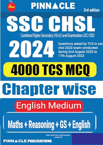 This is CHSL (Combined Higher Secondary Level) chapter wise book with 4000 TCS MCQs with detailed explanation and exam oriented approach. In this book previous year’s questions and their solutions are given. This will help you to understand the exam pattern, the types of questions asked, and the level of difficulty. This book comes with All 4 subjects ie : maths, reasoning, general studies & english, These are latest exam questions asked by TCS in CHSL exam between 2nd Aug 2023 to 17th Aug 2023. This book is highly useful for ssc chsl tier 1, ssc chsl tier 2, 2024 exam. You will find the best arranged questions, high quality paper, high quality binding & no water mark for your distraction free preparation Salient Features of the book : 1. 61 chapters covering the entire SSC CHSL 2023 Exam. 2. Includes all four subjects ie : Reasoning, General Studies, Quantitative Aptitude & English. 3. chapters as per the latest TCS pattern. 4. Includes previous years’ questions of SSC CHSL tier 1. 5. One stop solution for ssc CHSL aspirants.
